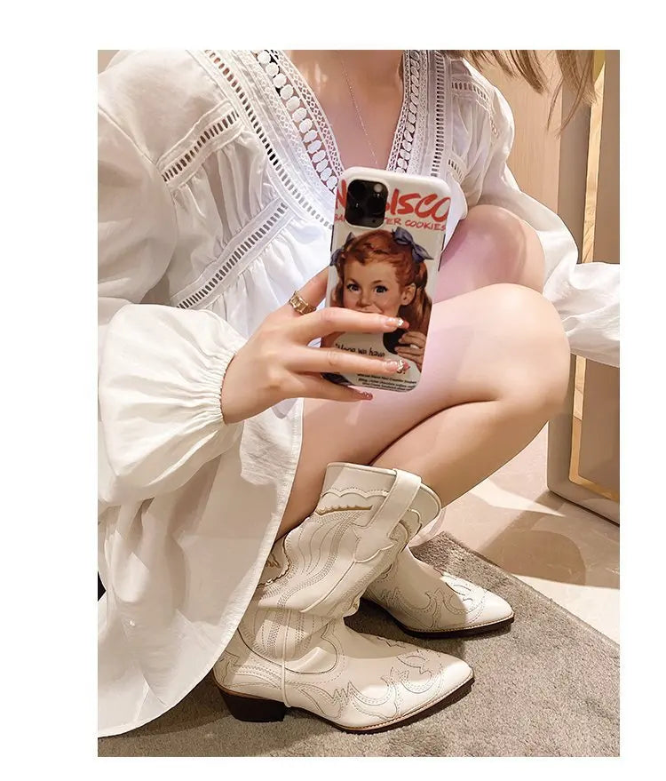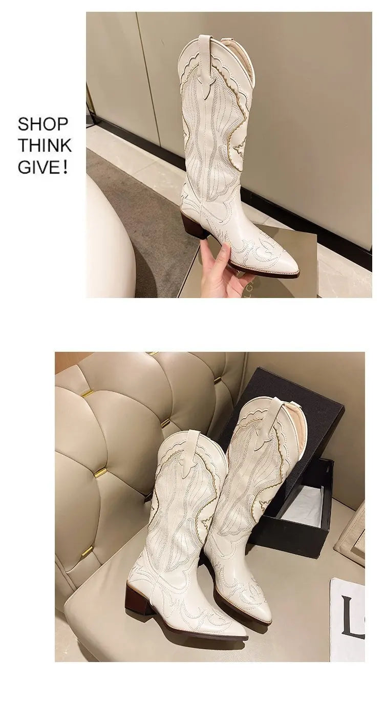 Bottes de cowboy brodées d'automne nouvelles chaussures à talons carrés et pointues bottes longues à la mode décontractée chaussures imperméables confortables
