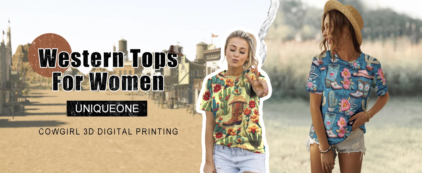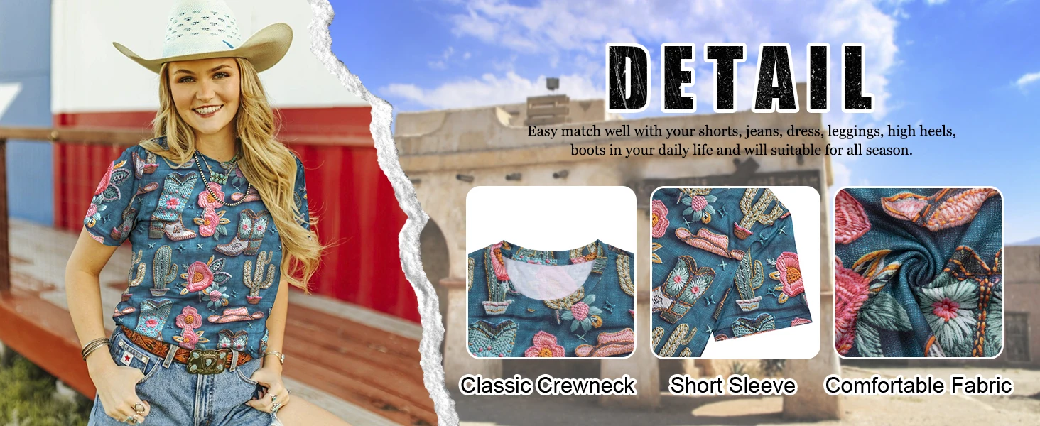 Cowgirl T-Shirt, Rodeo 3d Digital Printing, Western Cactus Graphic, crewneck, women's vintage T-shirt top, short sleeves, showcasing your beautiful collarbone and feminine temperament.
