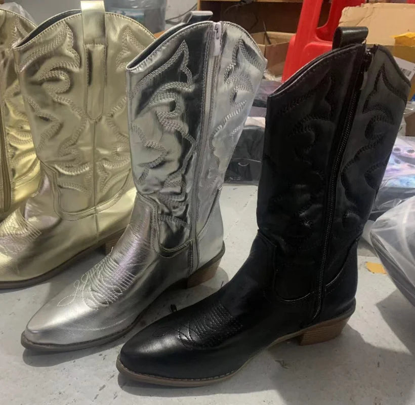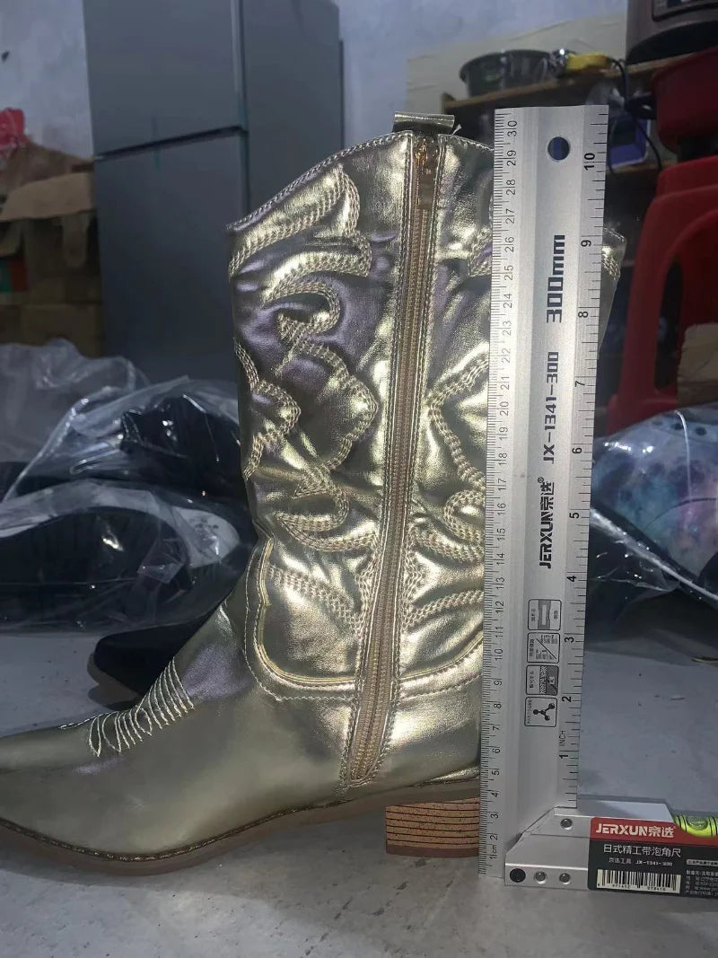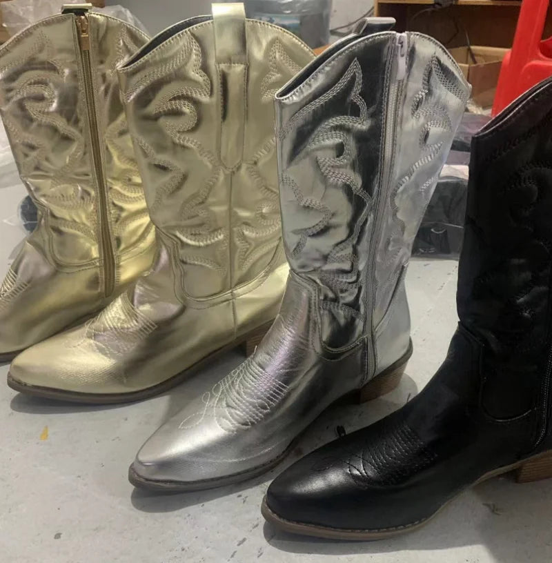 Bottes de cowboy western pour femmes, chaussures roses brillantes métalliques brodées à bout pointu et à talons aiguilles