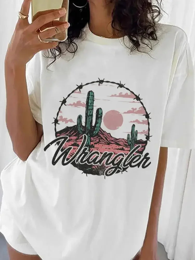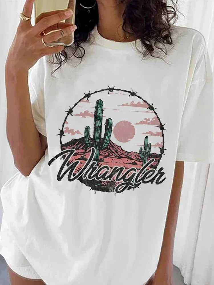 Chemise western en détresse, imprimé dessin animé tendance, nouveau style d'été, voyage et loisirs, col rond, haut basique et polyvalent pour femme, imprimé T-S