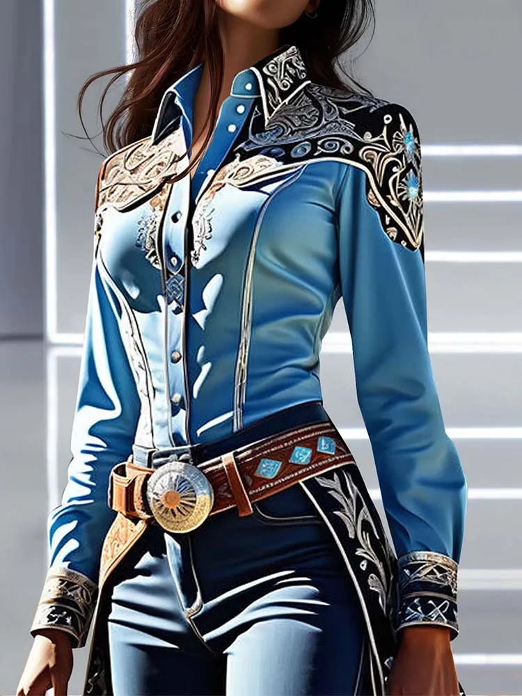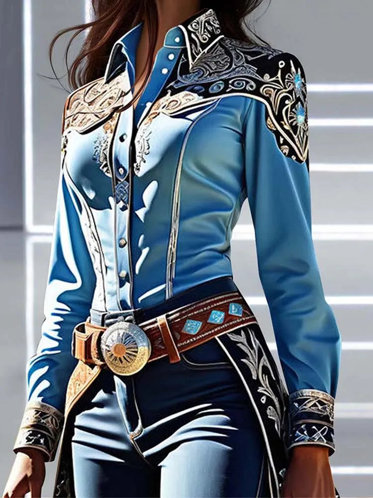 Elegant Chic Women Tops Western Print Shirt Collar Buttons Long Sleeve Blouse Patchwork Slim Waist Office Lady Shirts Blouses