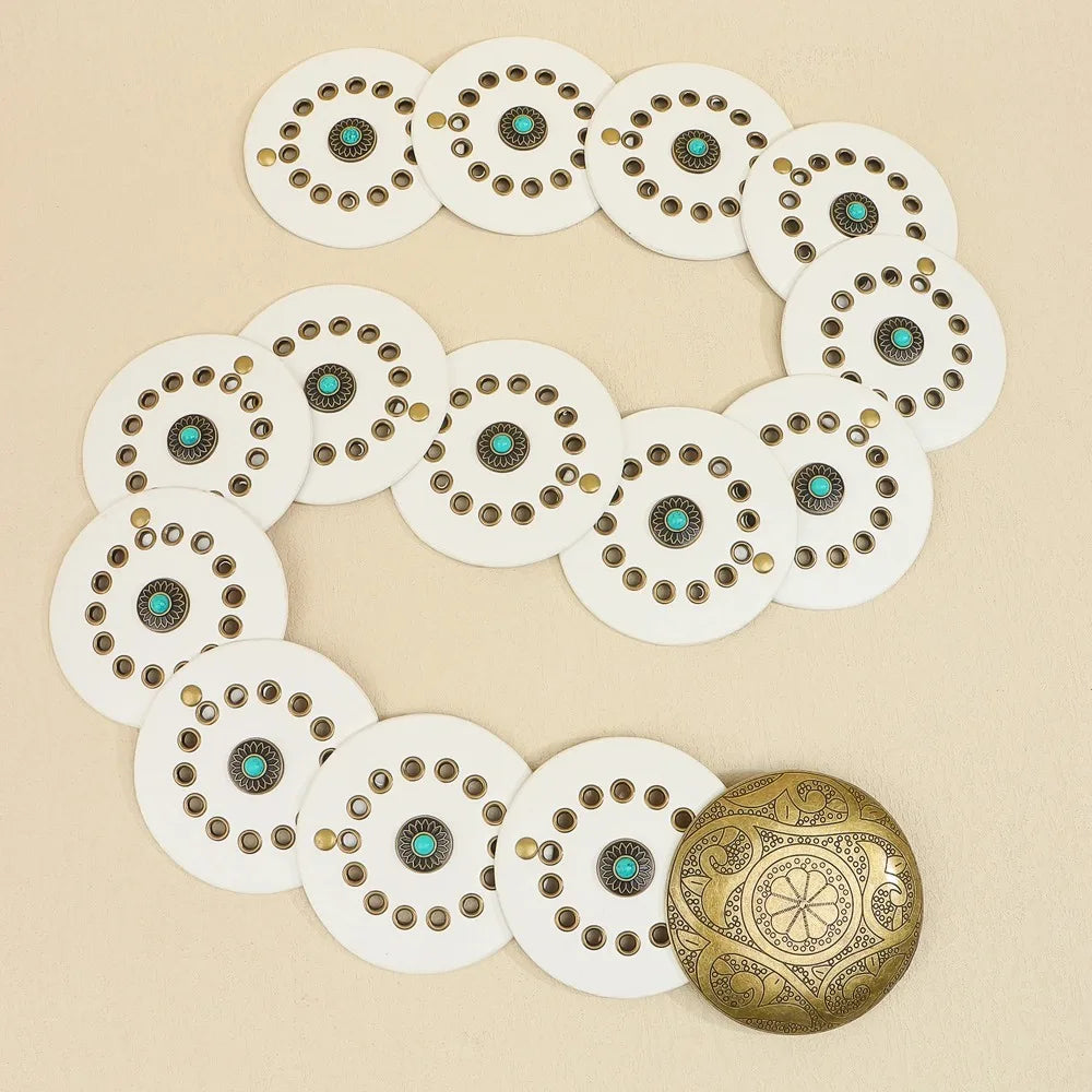 Exaggerated Wide Boho Disc Belt Rivet Turquoise Carved Buckle Waist Belt Adjustable Alloy Western Leather Waistband Cowgirl
