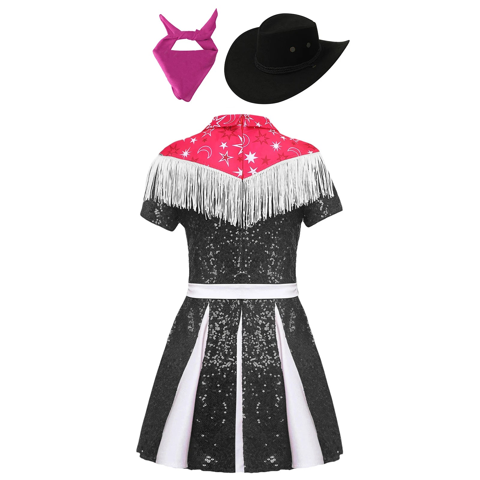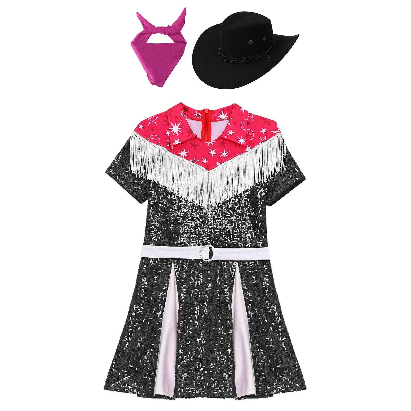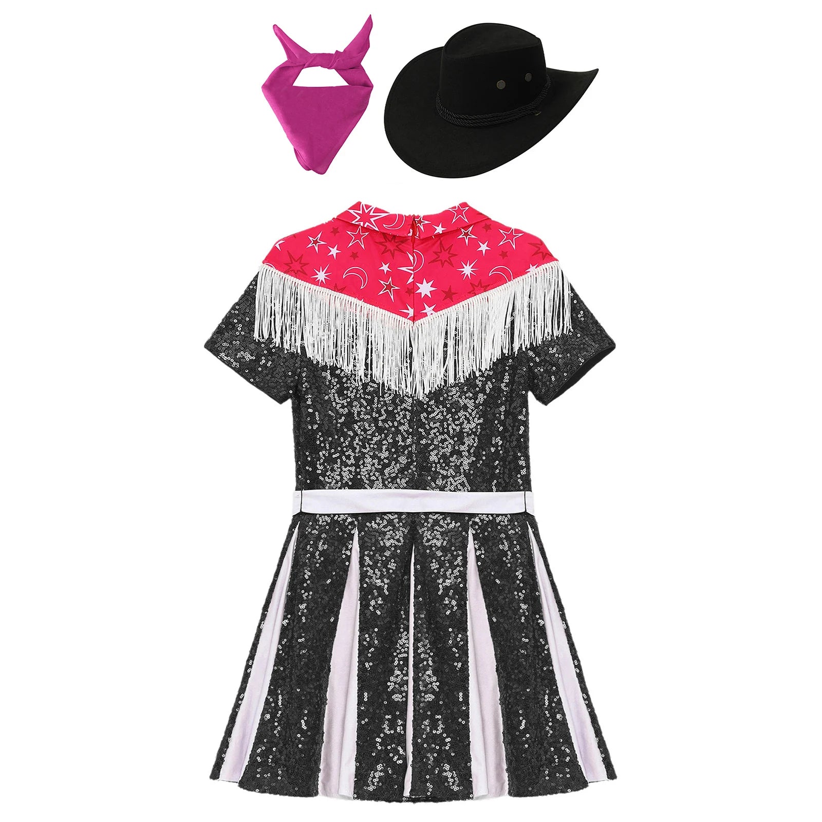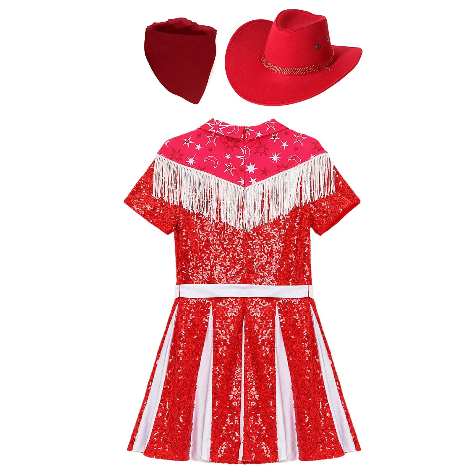 Costume de cow-girl western 3 pièces pour fille, robe plissée à paillettes avec chapeau de cowboy et bandana, pour Noël, Halloween, fête