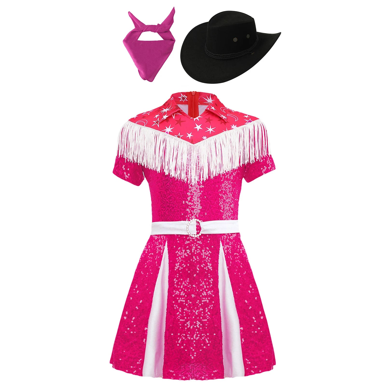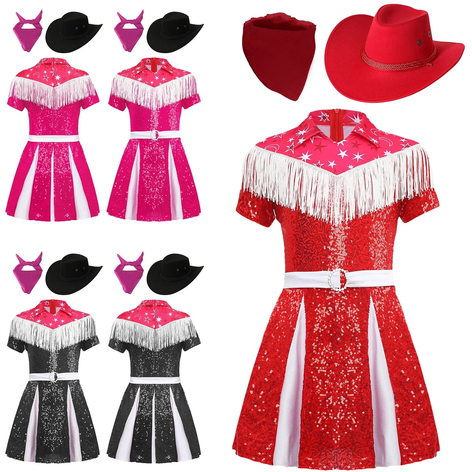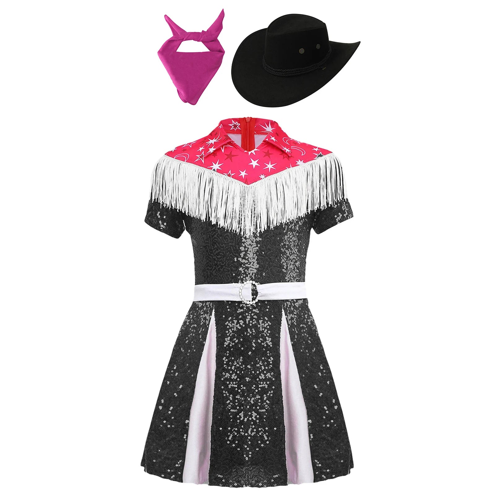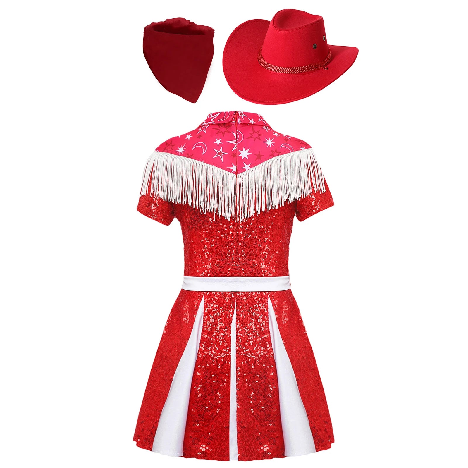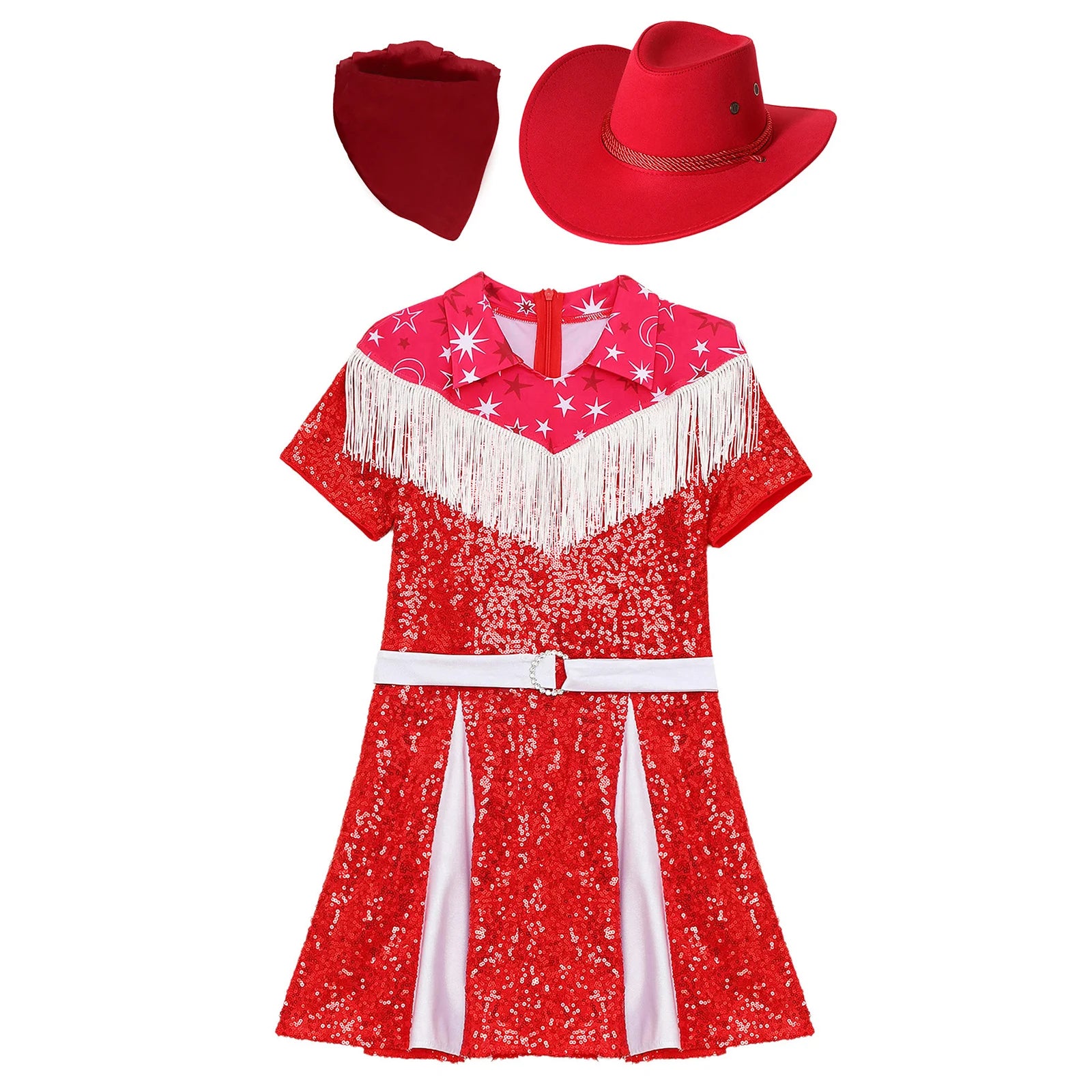 Costume de cow-girl western 3 pièces pour fille, robe plissée à paillettes avec chapeau de cowboy et bandana, pour Noël, Halloween, fête