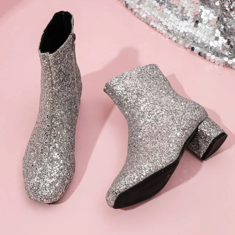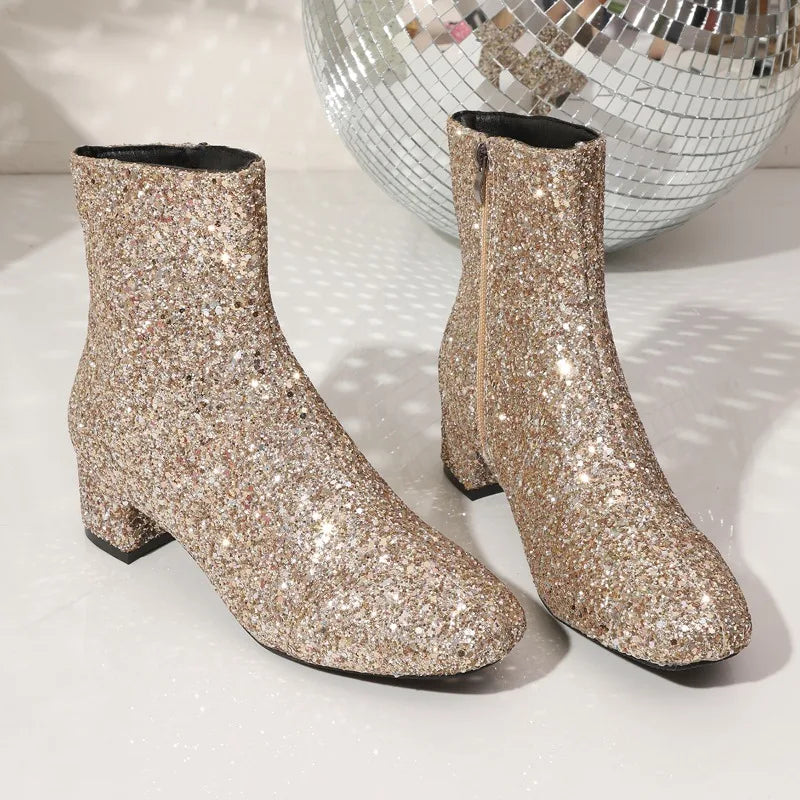 Glitter Fashion Sequins Boots Women Zipper Chunky Heel Women's Boots Round Toe Chunky Heels Ankle Boots Party Shoes for Women