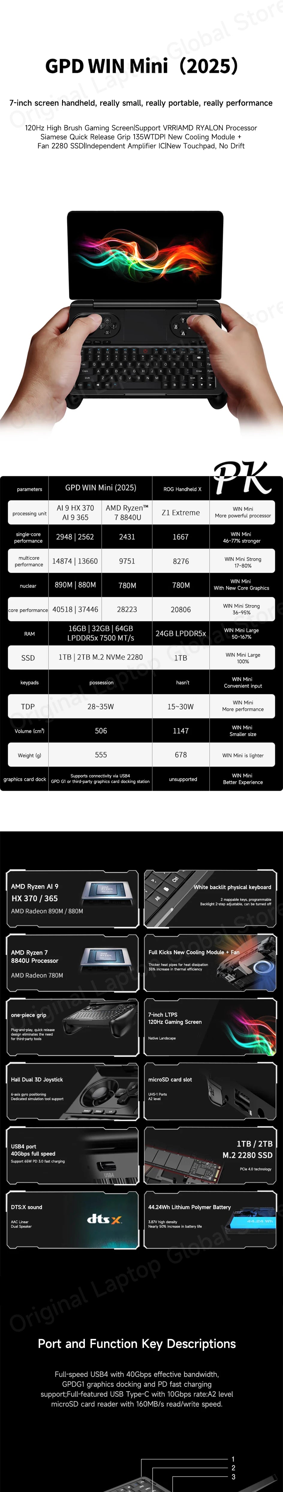GPD WIN Mini 2025 Ryzenâą AI 9 HX 370/Ryzen R7 8840U 7-inch Pocket PC 32GB RAM 2TB SSD Mini Laptop