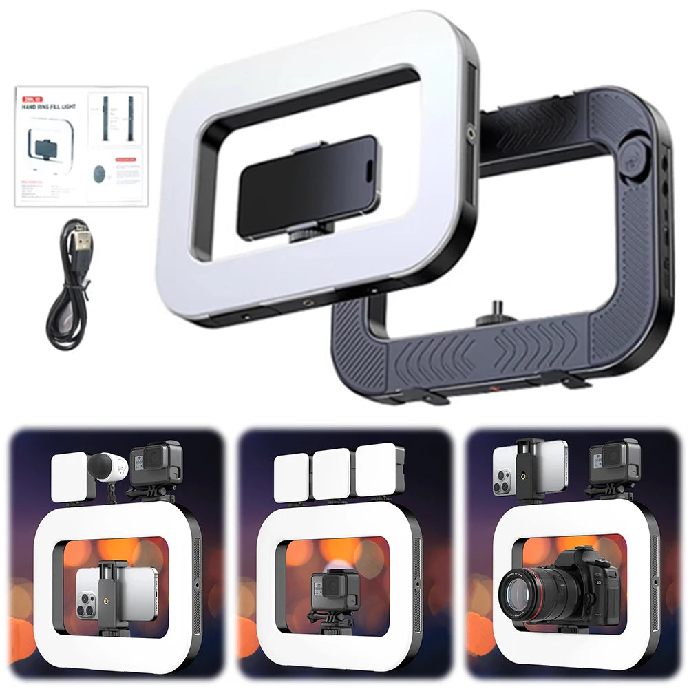 Note: Smartphone Video Rig with Light Light Cell Phone Handheld Stabilizer W/ Ring Light Handheld Ring Selfie Light Kit for Filmmaking Live Steam YouTube Video Recording Features: 1.Professional Lighting Output: Enhance your video quality with the smartphone video rig with light, featuring ring-shaped illumination that minimizes facial shadows and softens skin tones, eliminating harsh overhead lighting effects. 2.Versatile Design: Utilize this handheld ring selfie light kit for both handheld and desktop applications. It easily mounts on tripods and integrates seamlessly with various shooting setups. 3.Convenient Compatibility: The LED phone light is designed for direct installation on phone cages without occupying charging ports, suitable for Bluetooth-compatible remote control features in specific models.4.Enhanced Shooting Efficiency: Ideal for smartphones and cameras alike, offering compatibility with mobile clamps and camera hot shoe adapters. 5.Ideal for Content Creators: for low-light recording, product photography, beauty selfies, and virtual meetings, ensuring you always get the best shot. Specification: Origin: Mainland China Product size: 295.00x225.00x30.00mm Product size: 11.61x8.86x1.18inch Light source power: 20W Voltage: 110v Type: LED fill light Usage: handheld Main application: live photography fill light Function: three color temperatures Material: ABS Color: as shown