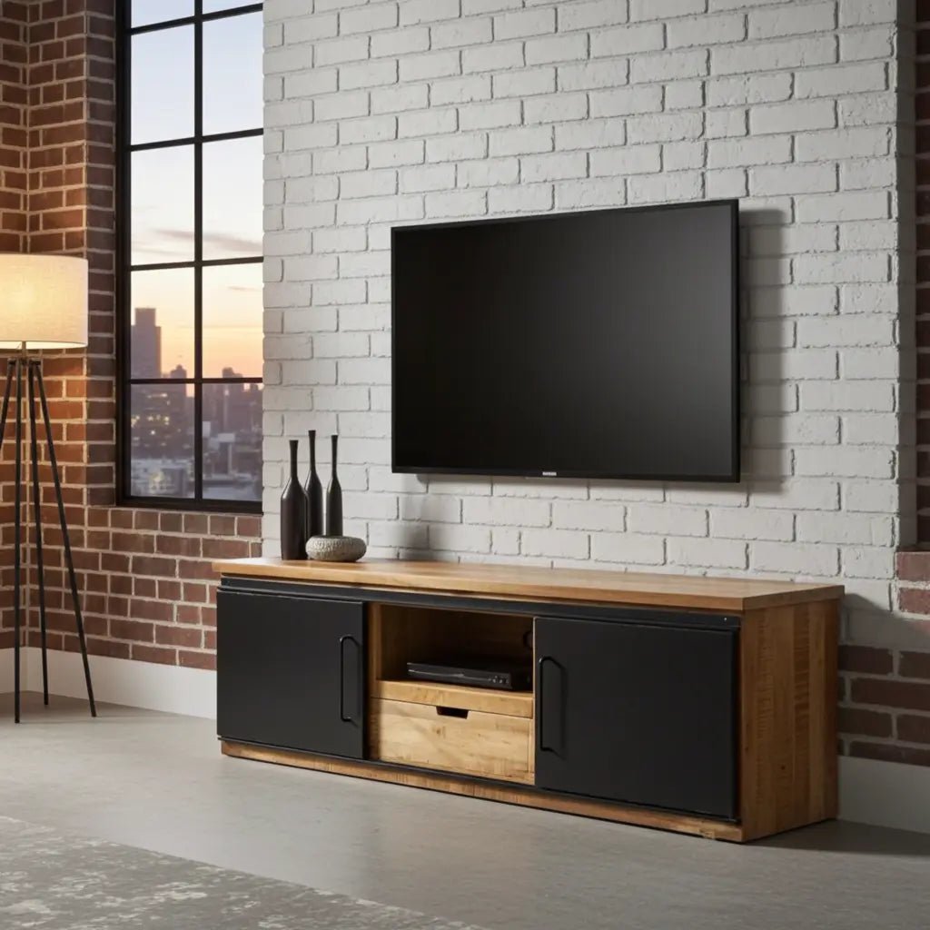 Meuble Télé en bois de Manguier avec 2 Portes Coulissantes en acier : L'Esthétique Industrielle Fluide