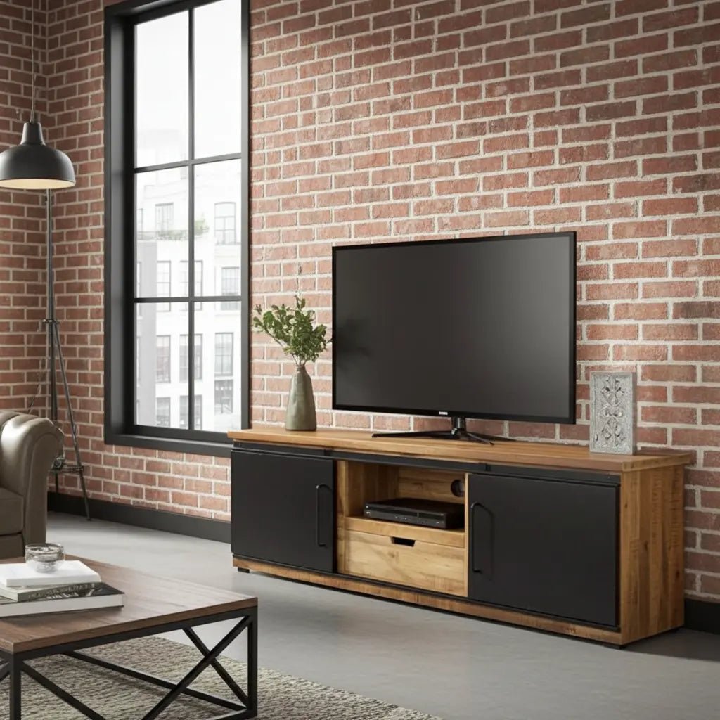 Son originalité réside dans ses deux portes coulissantes en acier, montées sur un rail apparent, offrant une touche mécanique et urbaine à la chaleur naturelle du bois. Avec sa longueur de 79 pouces, il est le support idéal pour créer un centre de divertissement sophistiqué et ordonné.