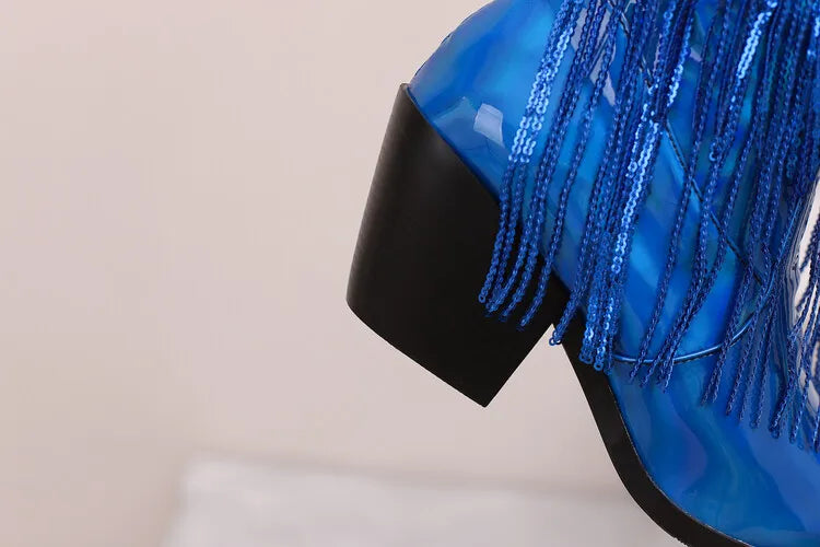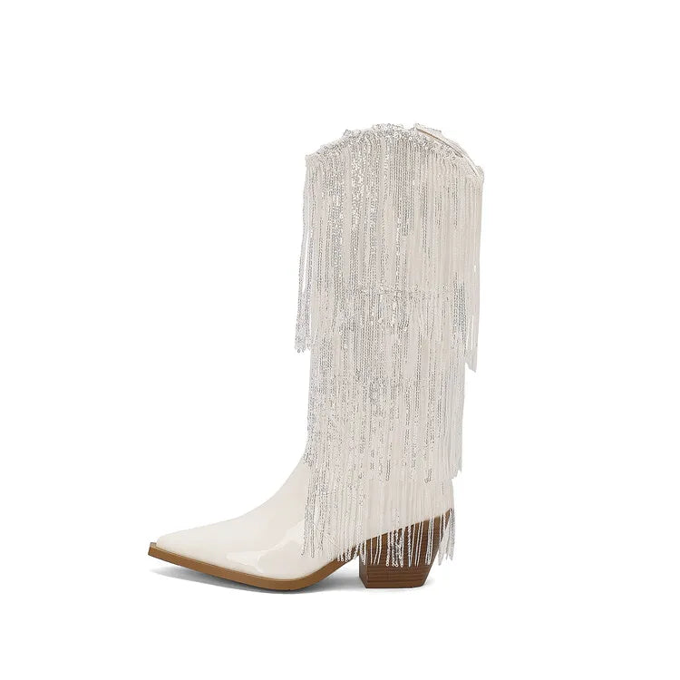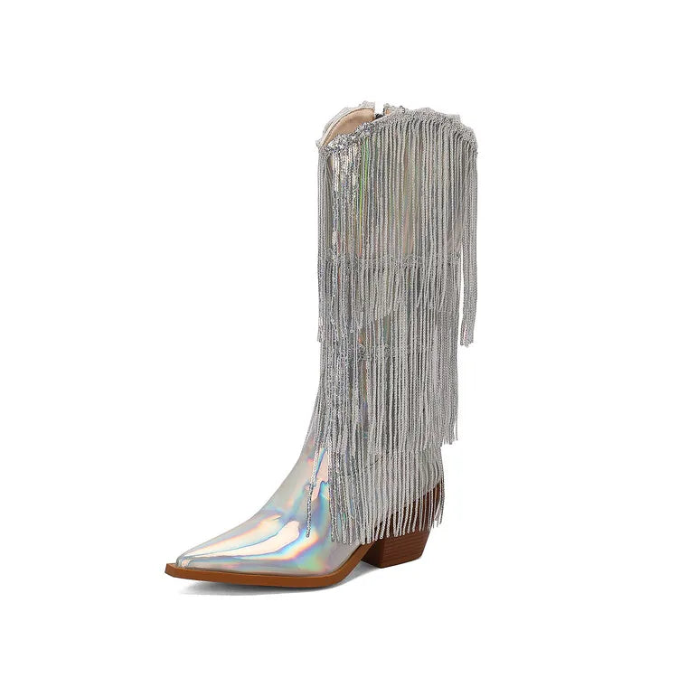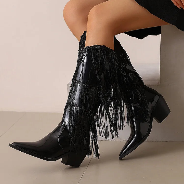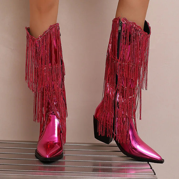 Chaque pas devient un spectacle. Les longues franges fluides, ornées de sequins scintillants, bougent avec grâce et créent un effet visuel hypnotisant. Que vous choisissiez le noir profond, l’argent lumineux, le rose métallique flamboyant, l’irisé futuriste ou le bleu électrique, ces bottes transforment instantanément votre tenue en look de scène, de festival ou de soirée country chic.