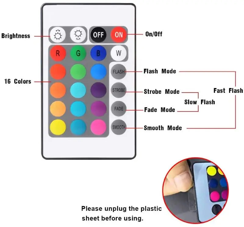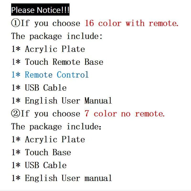 Remote control and touch switch: Remote control: set 16 colors;Touch switch: set 7 colors