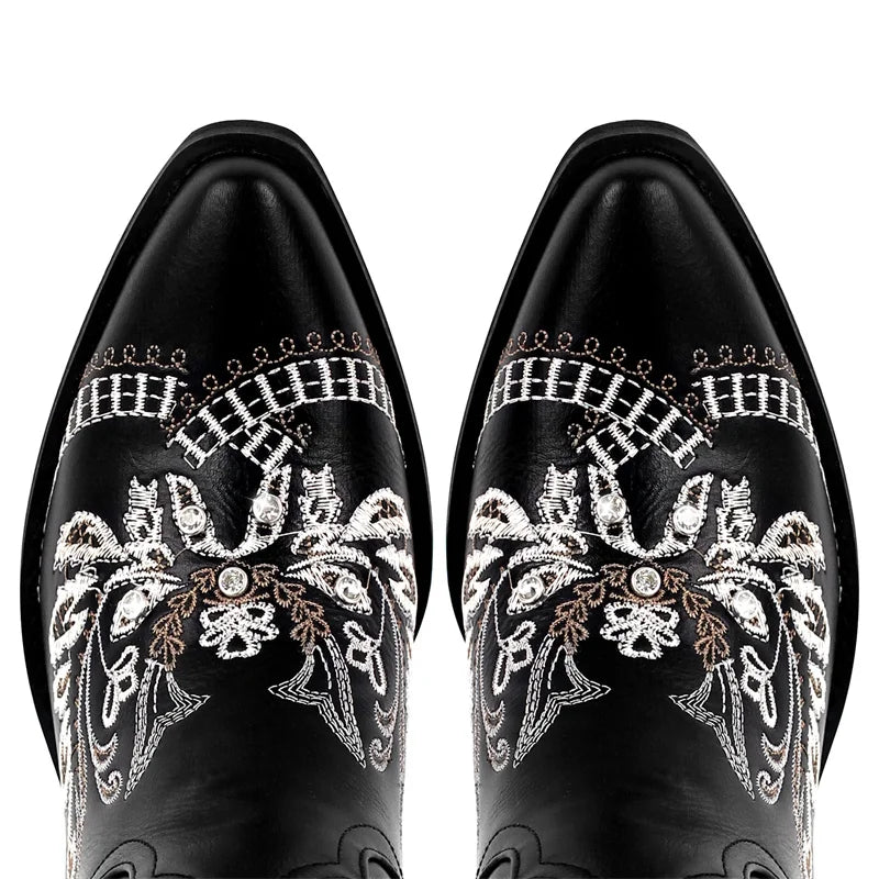 Bottes de cowboy blanches brodées Onlymaker pour femmes, à talon bloc, bout pointu, ornées de cristaux, style cowgirl.