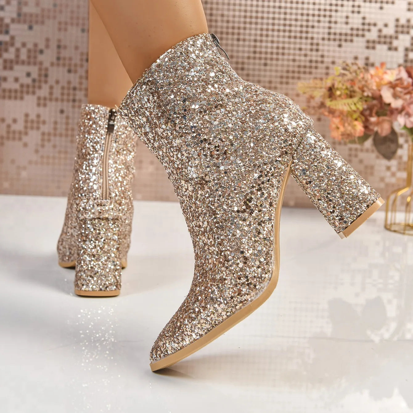 Women Boots 2025 New Fashion Sequins Round Toe Ankle Boots Women Autumn Winter Party Chunky Heels Shoes for Women Botas De Mujer