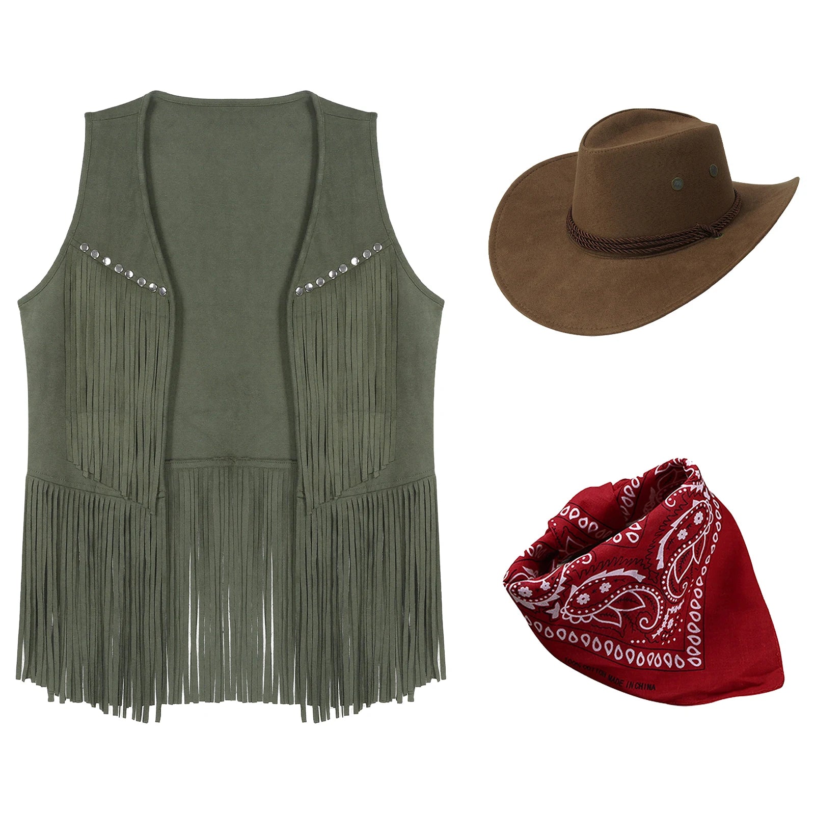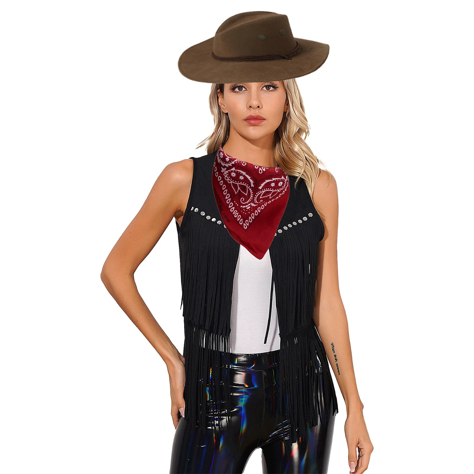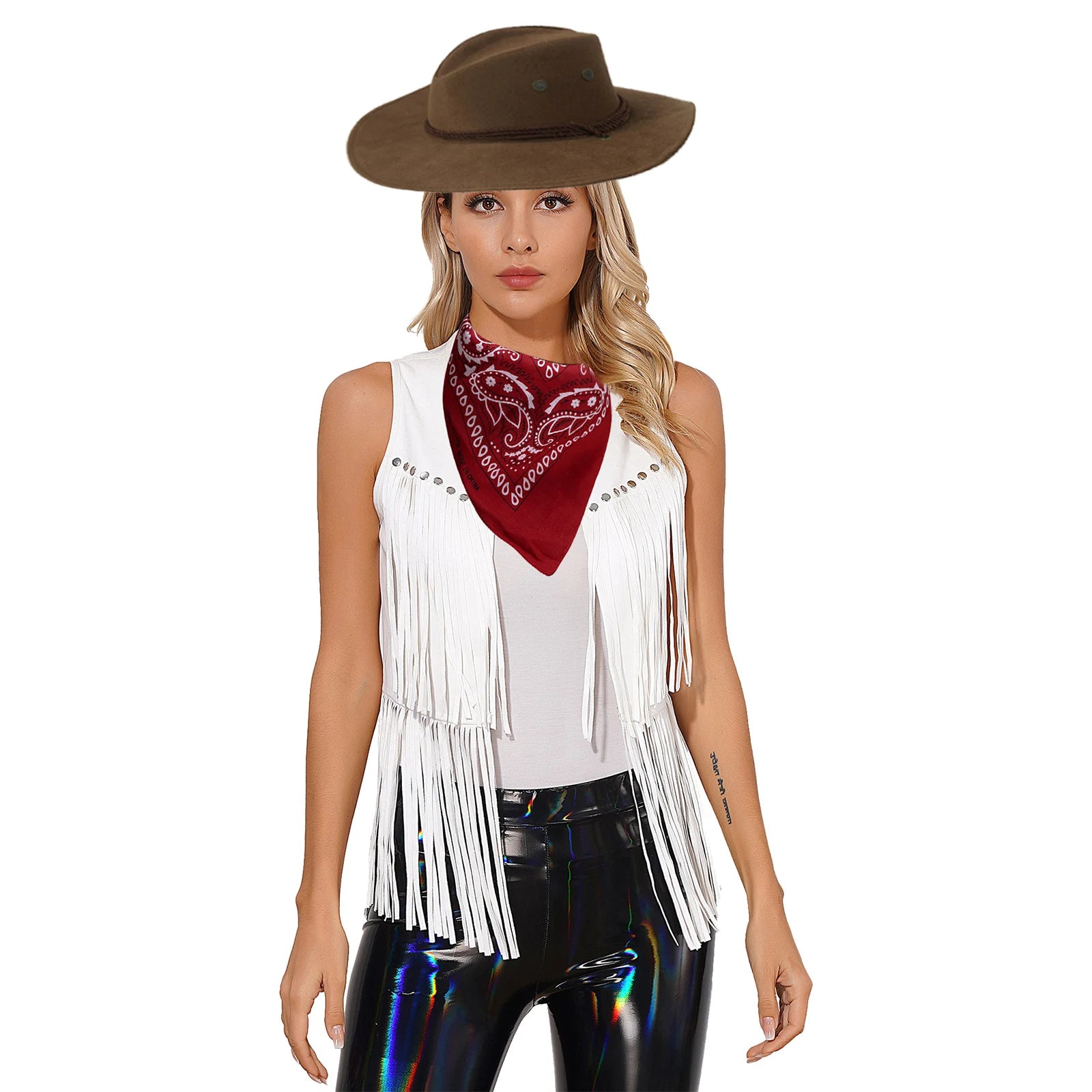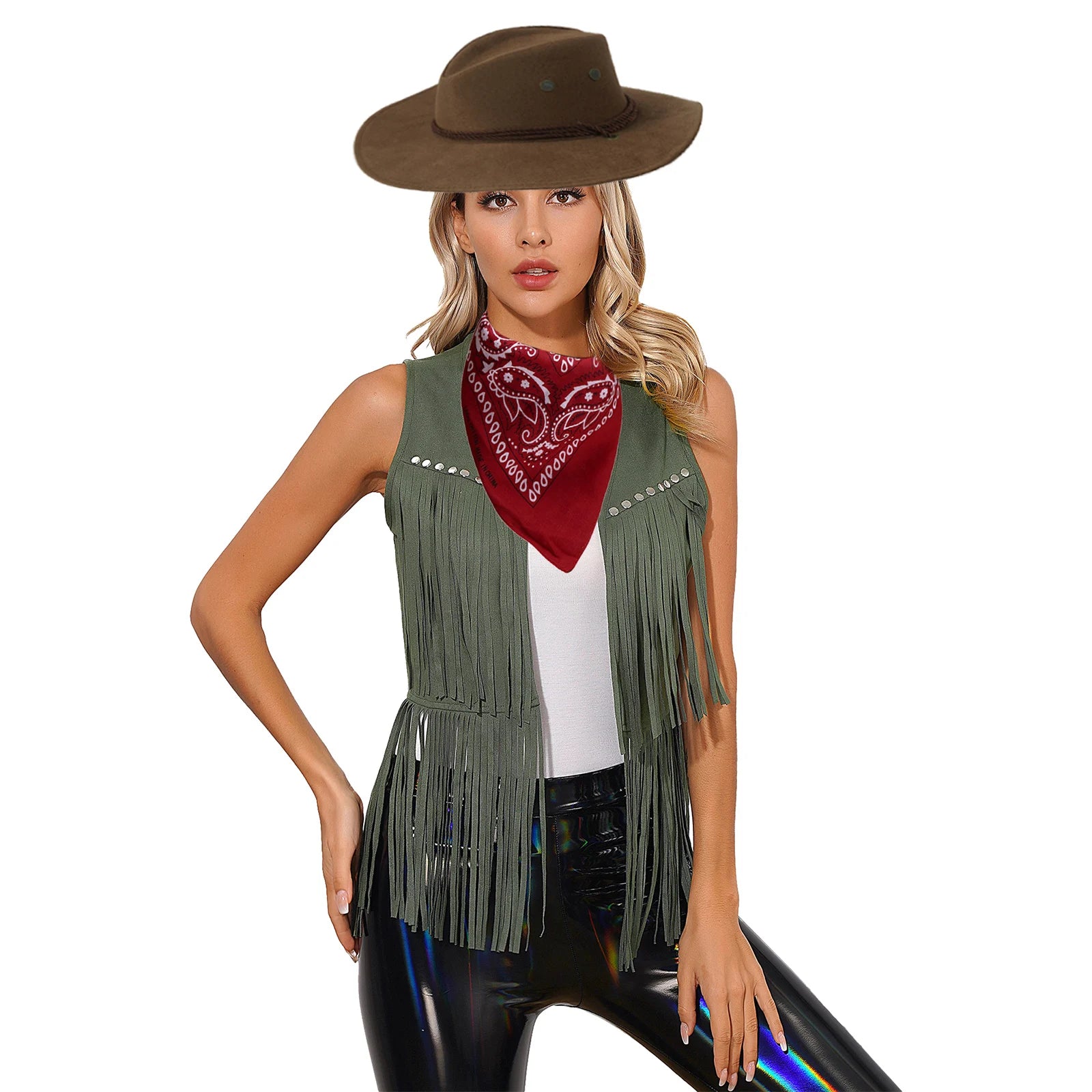 Gilet de cowboy pour femme, costume de cosplay, en faux daim, avec pompons et rivets, pour Halloween, avec bandana