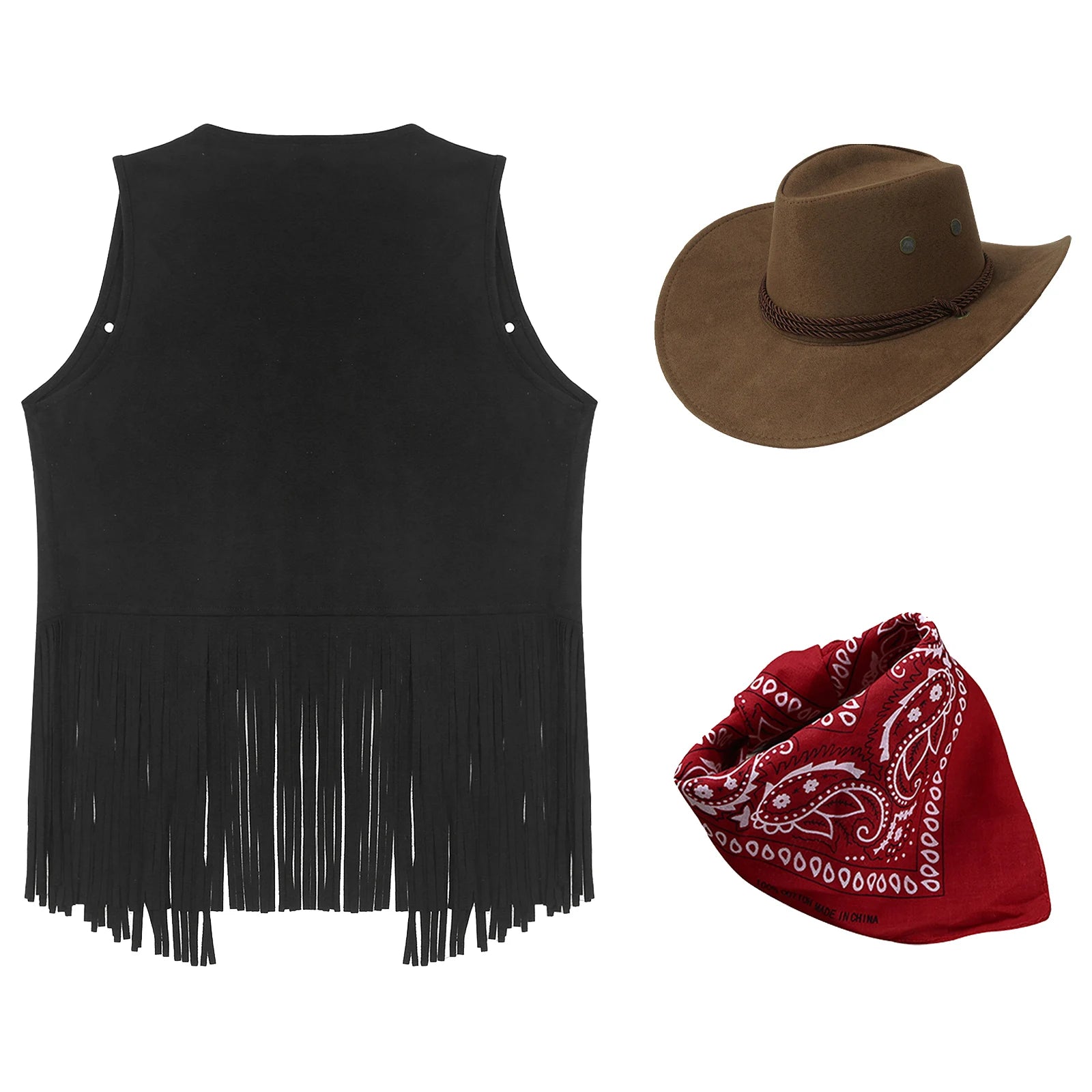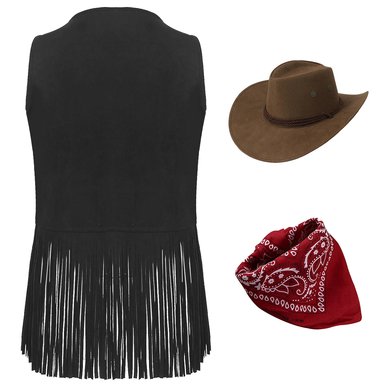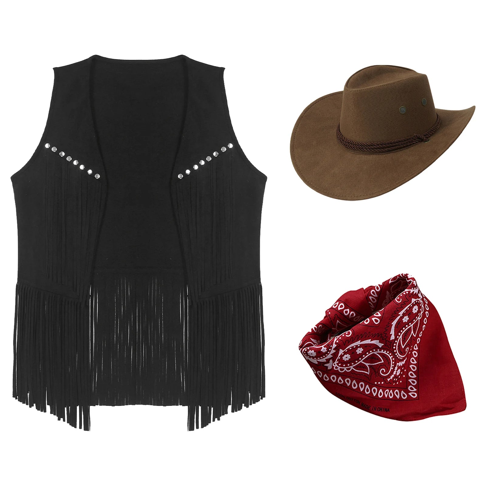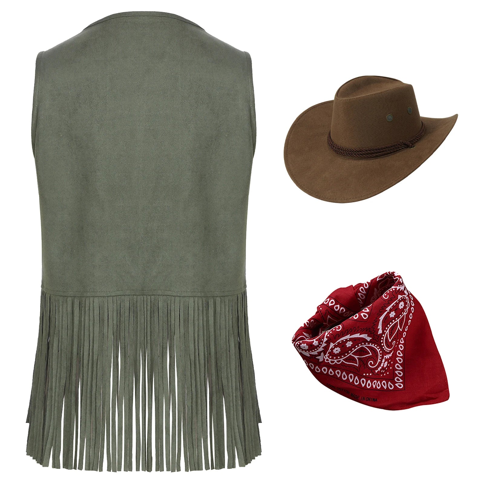 Gilet de cowboy pour femme, costume de cosplay, en faux daim, avec pompons et rivets, pour Halloween, avec bandana