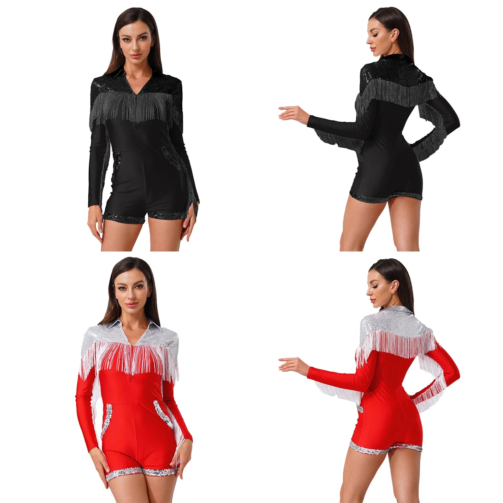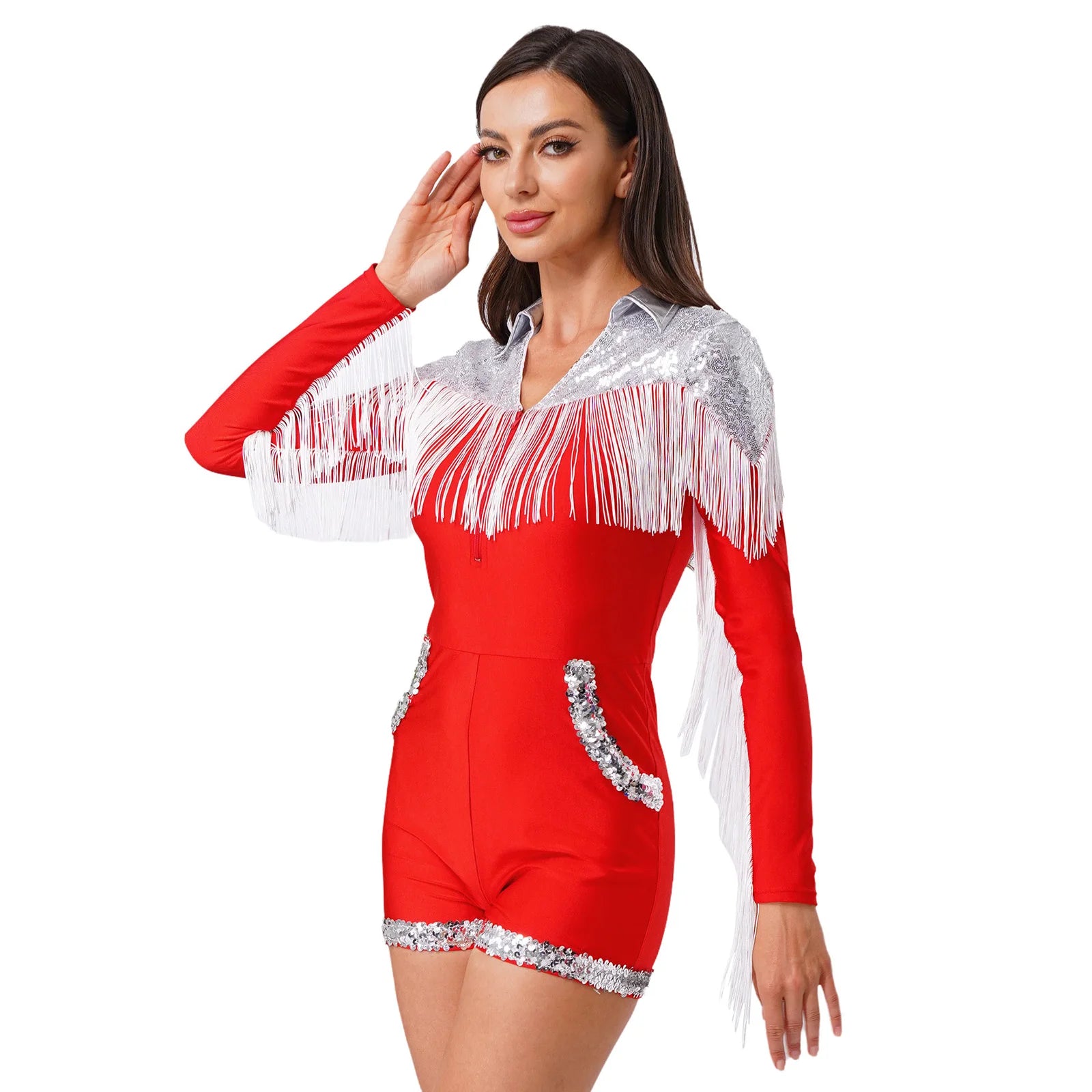 Womens Sequins Western Cowgirl Cosplay Costume Tassel Fringe Boyshorts Rompers 70s 80s Disco Bodysuit Front Zip Playsuit