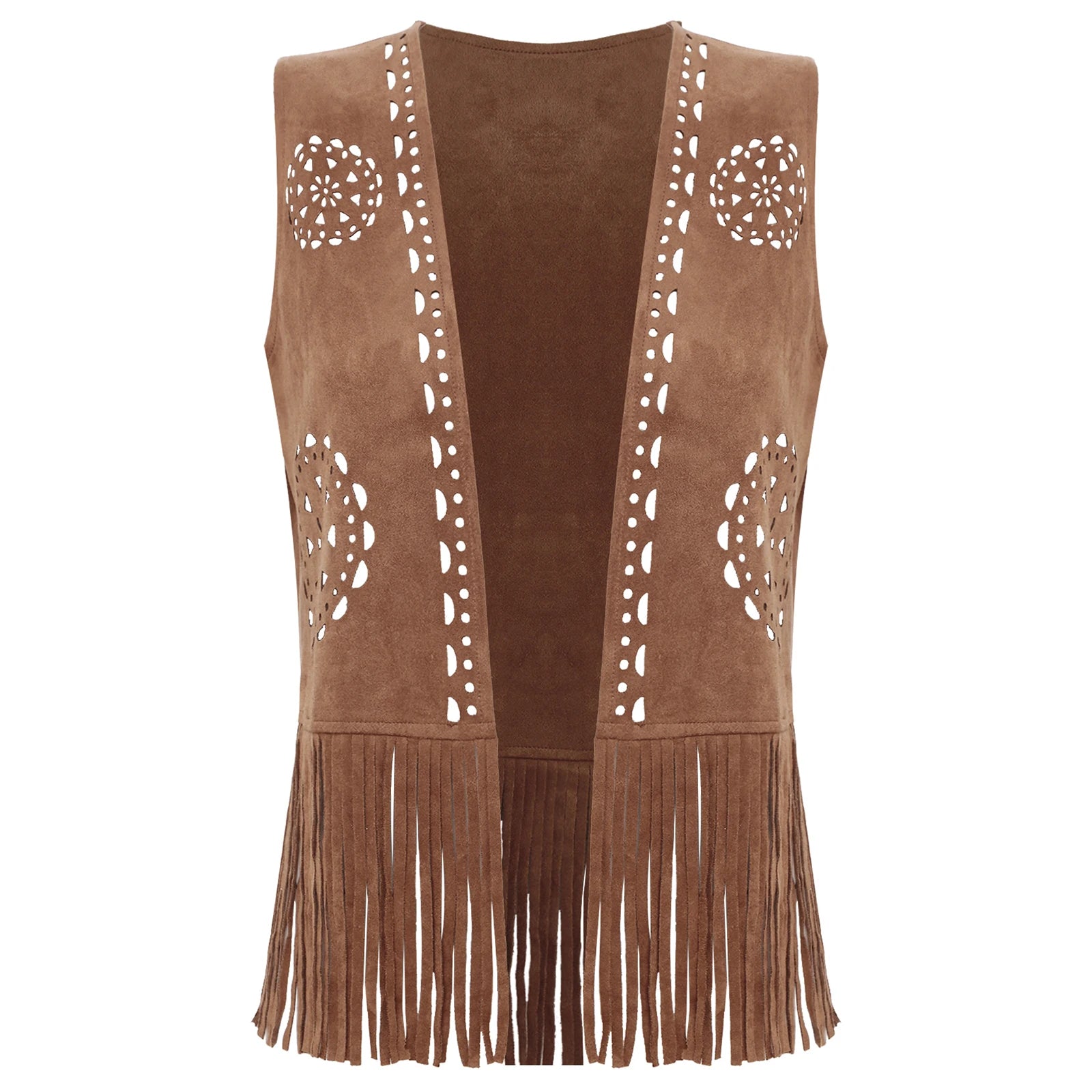 Débardeur vintage à franges style cowgirl hippie style années 70 pour femme, style disco, style années 70, ajouré, pompon, gilet en faux daim